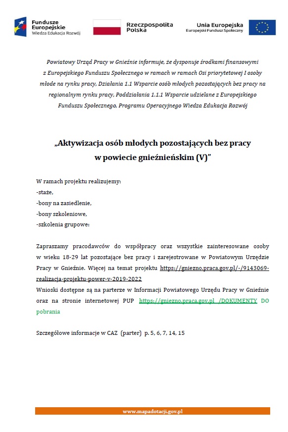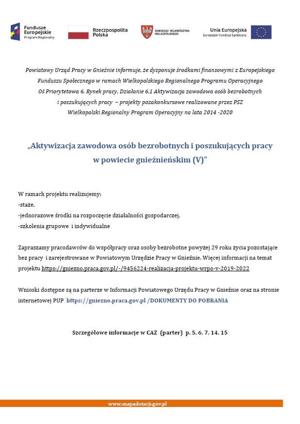 Poniżej podajemy informację skierowaną do osób bezrobotnych i poszukujących pracy oraz lokalnych pracodawców, dotyczącą realizowanych przez Powiatowy Urząd Pracy w Gnieźnie projektów POWER i WRPO.